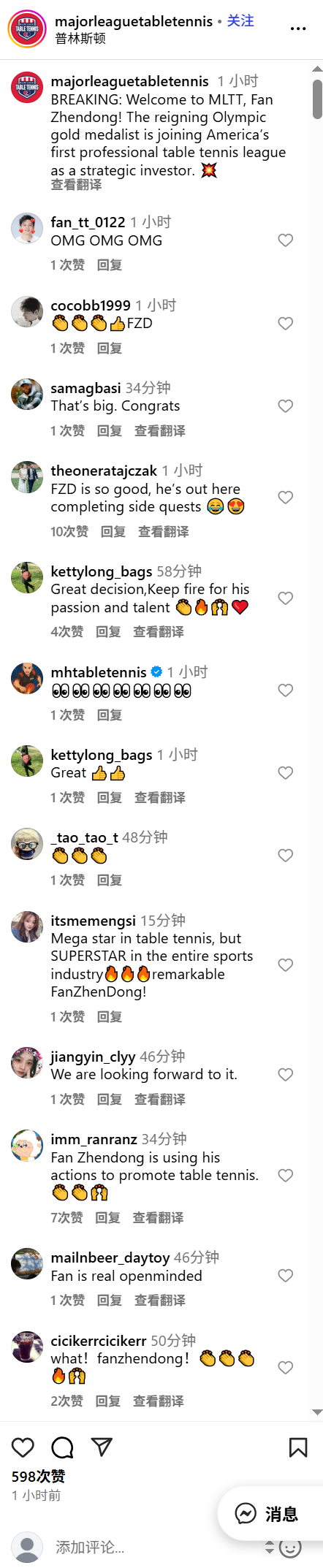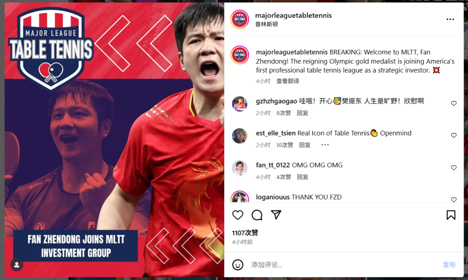 今天晚上樊振东突然又上了热搜,起因是有网友看到,美国的职业乒乓球联赛MLTT官方发布了一则消息,通报了樊振东将成为该项赛事的“战略投资者”。不得不说,樊振东真的是中国运动员里少有的具有国际视野的人,难能可贵。